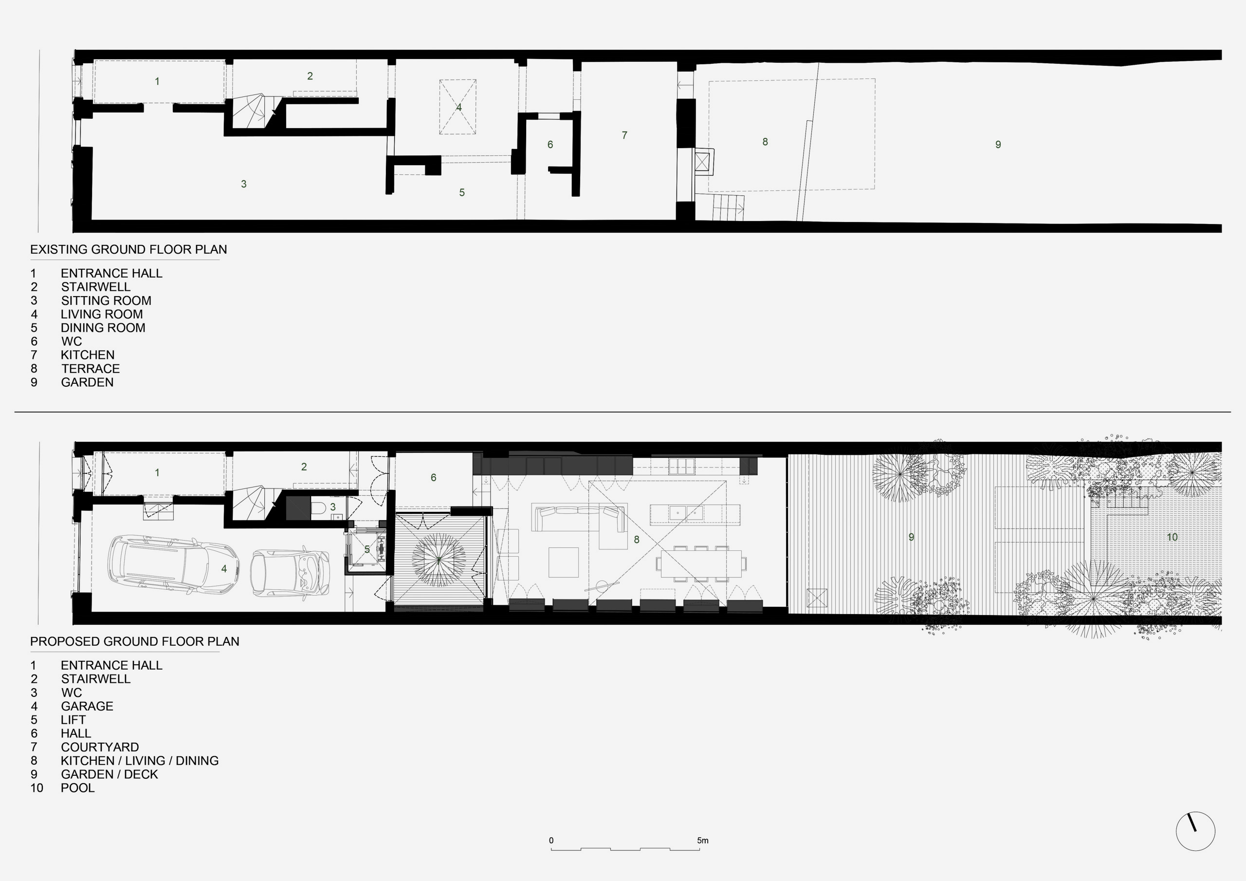 The rear garden transforms the urban site into a private oasis with Mediterranean planting and a limestone-edged pool, extending the living space beyond the building envelope. This outdoor area becomes integral to the living experience, creating a layered sequence from street to interior to garden that amplifies the sense of retreat within the constrained urban plot.