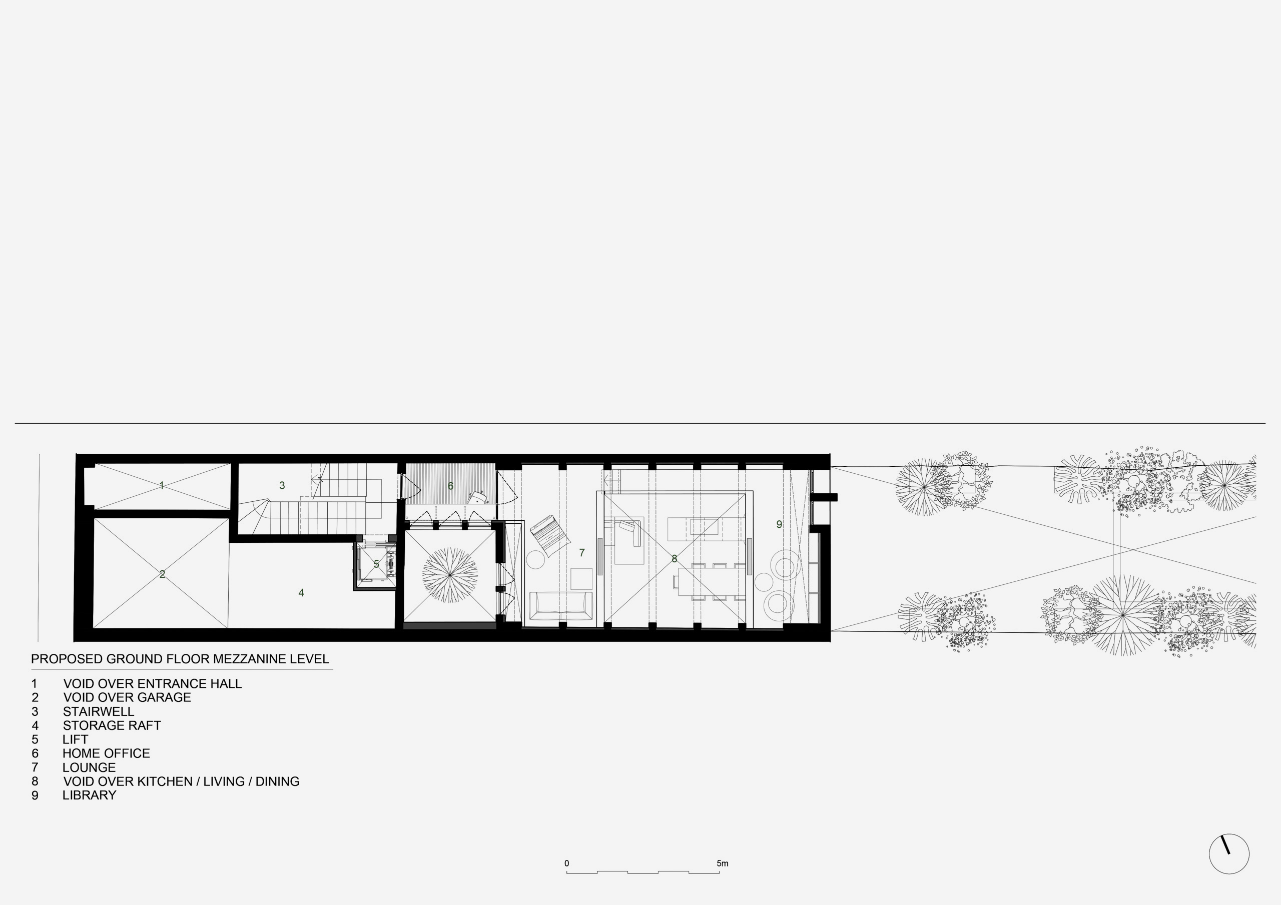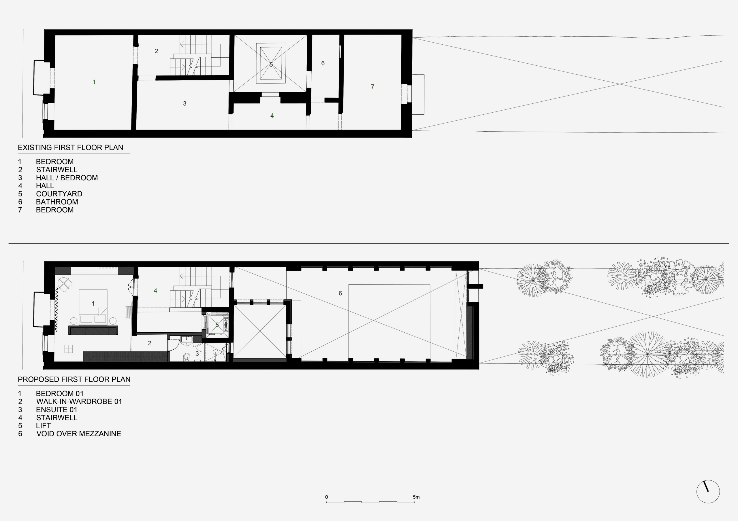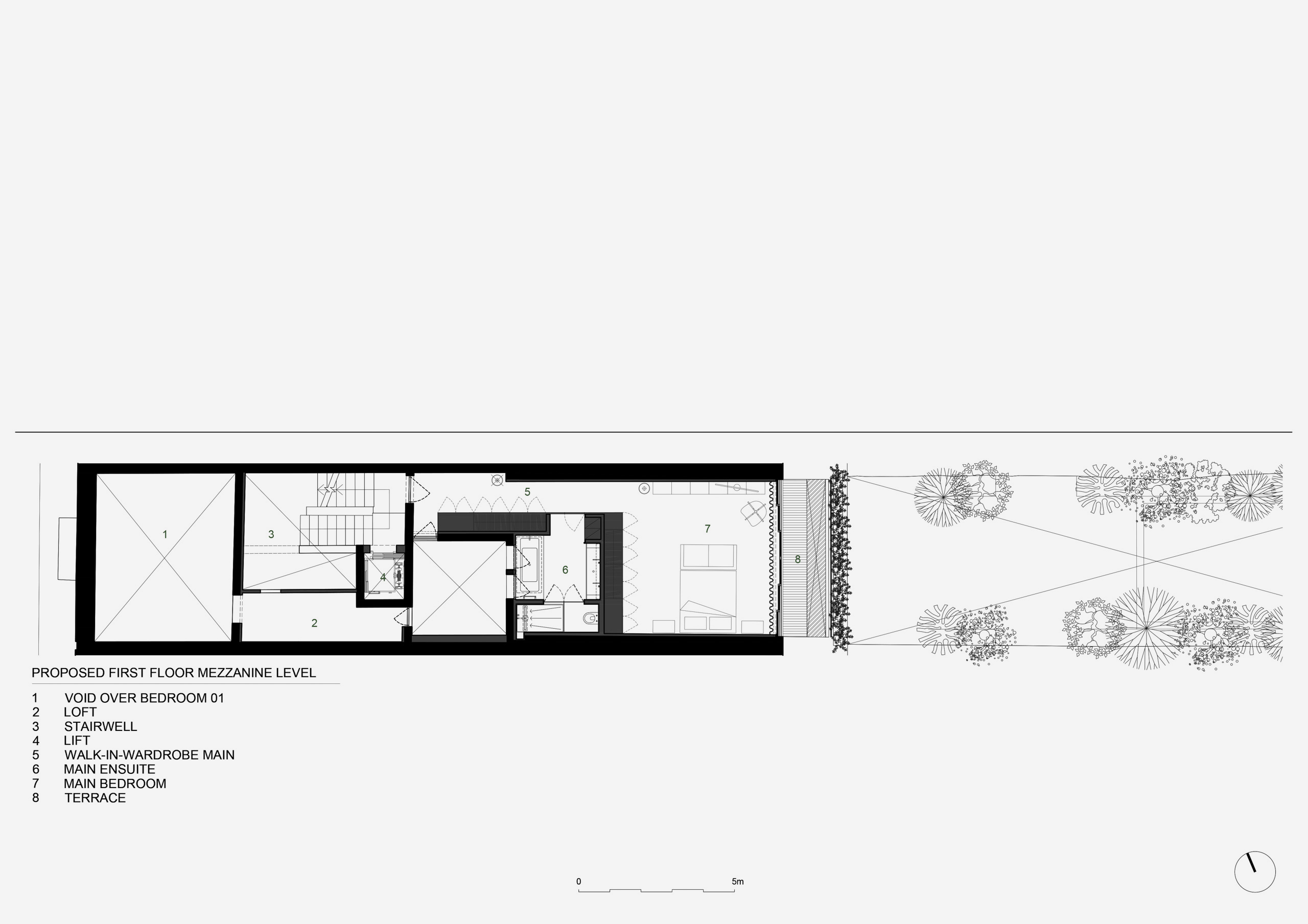 An internal courtyard provides the conceptual hinge between old and new, while strategically placed skylights and high-level windows introduce natural light and cross ventilation throughout the residence. Bedrooms are arranged in a staggered configuration, positioned half a floor apart to maintain privacy while preserving connectivity. The master suite incorporates a concealed bathroom, set behind a door that integrates seamlessly into the bedroom’s custom-designed joinery.